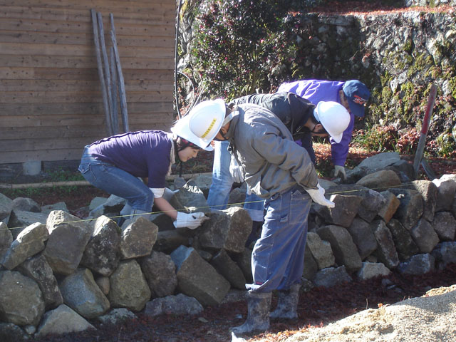 坂折棚田石積み塾。2008年11月29日撮影。岐阜県恵那市中野方の坂折棚田。棚田百選のなかでも石積みの棚田が残るところとして著名。展望所の近くに「さかおり茶番処」という施設があって、来訪者にお茶を振る舞ってくれる。その横で石積み塾が開催されていた。石積みの経験が全くない人に石垣の作り方を教えてくれるというものである。まずは平らなところでトレーニングをする。次に、棚田の現地に行き、石積みの壊れているところの修復を行う。回想してみると、東京都の多摩川上流でも、1950年代までは石垣石工がいて何人かの人夫を使いながら石積みを行っていた。子供の目には、その作業を見るのが面白くて何時までも立っていた覚えがある。今回目の前で行われているのは技術の伝承のための作業である。もう半世紀も経ってしまったかとの感慨あり。