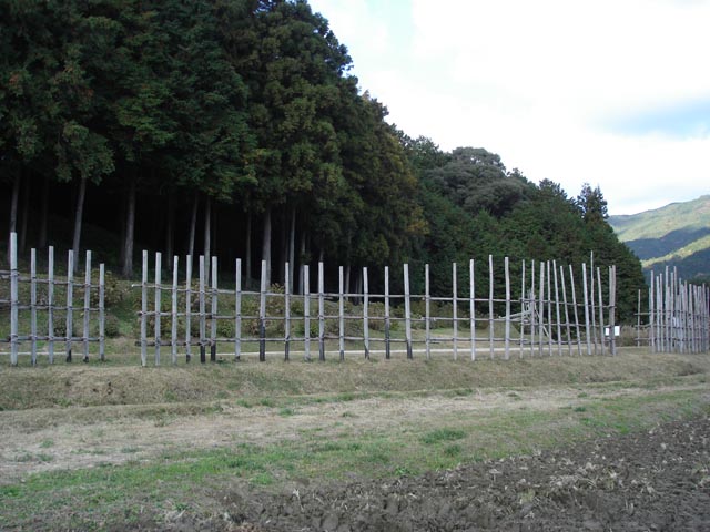 設楽原の復元馬防柵。2008年11月30日撮影。天正3年の「長篠合戦」として知られる織田・徳川連合軍と武田軍が戦った古戦場。成瀬家本「長篠合戦図屏風」によれば、徳川軍の主力部隊は馬防柵の前に出て、連吾川との間にあって鉄砲を撃ちはなっている。家康譜代の家臣団の活躍と鉄砲の集中使用を強く意識した図柄になっており、 成瀬家の制作意図が明確にされている。現地は複雑な地形をしているが、南北に流れる連吾川付近は若干の見通しがきく地勢となっていて、鉄砲の集中使用は彼我ともに認識されるところであった。