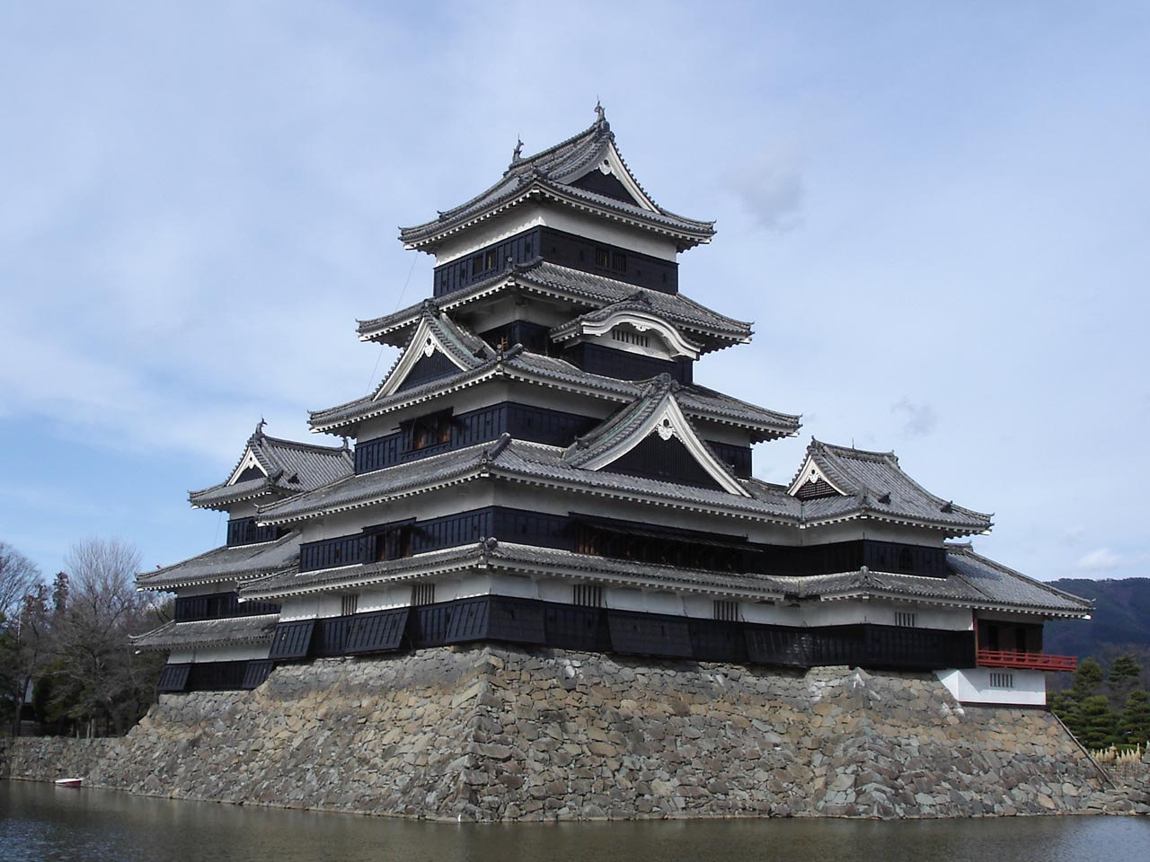 松本城天守閣。2009年3月11日撮影。1590年石川数正がこの地に入部し、大規模に改修。彼は徳川家康の重臣でありながら小牧長久手の戦いの後に出奔し、豊臣方についたことで知られる。文禄慶長の役に出陣し、名護屋で病没してしまうが、全体構想は彼のプランであったと考えてよい。特筆すべきは、惣構えの外側に四つの巨大な丸馬出が存在したことである。現在でも惣堀が一部残存していて北の馬出の位置がわかるのは誠に貴重である。築城の名手加藤清正が見学に訪れたという言い伝えも頷けるものがある。日頃、二人は城郭についてどんな会話を交わしていたのだろうか。