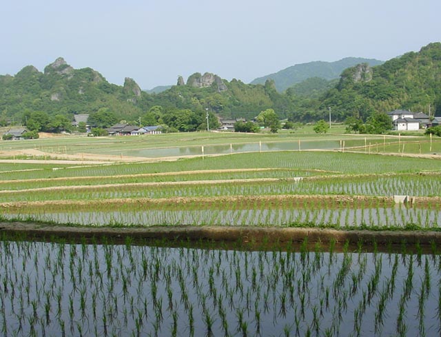 2003年6月8日撮影。豊後高田市田染小崎(たしぶおさき)。豊後高田市の人びとの努力によって、文化的景観保存地区としての取り組みが前進しつつある。平和な田園風景だが、「赤迫」と呼ばれる鎌倉時代以来の水田(写真の中央)を6メートル道路が横断する計画が立てられたこともあった。小さな立て札が見えるが、これは田染荘の荘園領主すなわち景観保存の趣旨に賛同したオーナーの名前が記されている。田園空間博物館構想により整備され、4件の農家民泊があって、炭焼体験などもできる。最近、初夏における蛍の群舞が風物詩となっている。