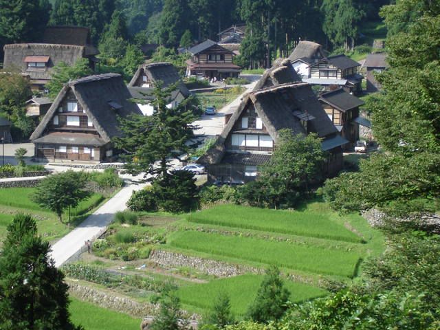 五箇山相倉の合掌造り集落(富山県南砺市)。2009年8月6日撮影。白川郷(岐阜県白川村)と同様に世界遺産に登録され、整備が進められているが、民俗的な雰囲気を濃厚に保っていて、落ち着いた佇まいを示している。案内板には天文21年の古文書により来歴がわかるとある。合掌造りの民家は20戸ほどで、かつては煙硝の製造、和紙の製造、養蚕製糸を行っていたという。集落の前面には石積みの棚田が折り重なるように段々を形成している。白川郷でも集落の周辺には水田が広がり、茅葺きの大屋根と見事に調和しているのが印象に残った。合掌造りの民宿は大賑わいだが、やはりここに日本的な安らぎがあるのだろう。