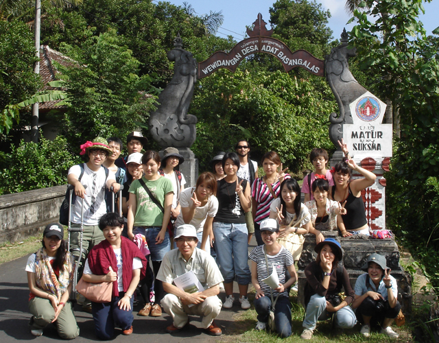 バリ島カランガスム県バサンアラス村。2009年9月5日撮影。テーマカレッジ「日本とバリ島」の現地授業も5年目となった。この日は、「京都大学 こころの未来研究センター」所長の吉川左紀子先生の一行とご一緒することとなった。例年通り、スバック・バサンアラスの水系をたどり、さらにプラ・プセを訪ねる。若者たちの祭りに遭遇し、少年組のガムランの演奏と青年組のバラガンジルを堪能することができた。彼らには伝統文化継承の気負いなどは全くなく、自然に学んで楽しく演奏していた。壮年・青年・少年のバランスの取れた年齢階梯が見られ、日本では失われてしまったムラの原風景があった。