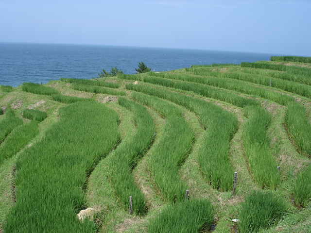 輪島市白米の千枚田。国の名勝指定を受けている。2009年8月6日撮影。日本海に面した急斜面に1.8ヘクタールの水田が広がる。17世紀から19世紀半ばにかけて造成されたという。水源は寛永15年頃、能登小代官下村兵四郎が開いた谷山用水。毎年、高い方の土手を削って水田に客土しているという。バリ島テガラランの棚田と同じ手法が用いられている。現在の日本では数少ない事例であろう。のり面が非常に原始的で、大阪府千早赤阪村の史跡赤阪城東斜面の棚田にも類似する。