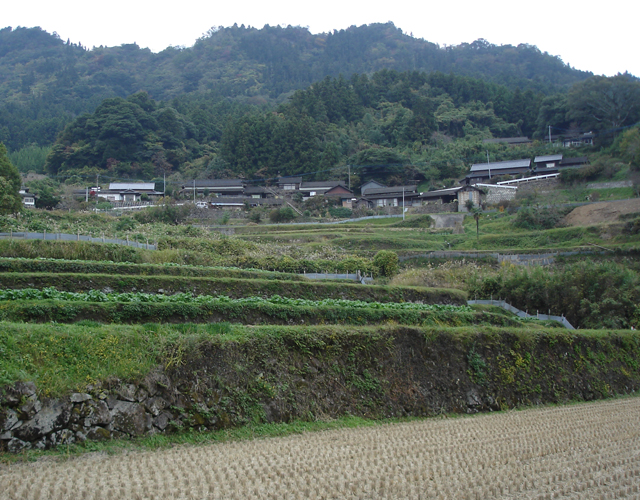 大分県杵築市山香町の芋恵良(いもえら)集落。2009年11月6日撮影。大分県立歴史博物館は国東半島荘園村落遺跡詳細分布調査として本年度から豊後国速見郡山香郷の調査を開始した。この詳細分布調査は、国東郡の田染荘を皮切りに、都甲荘、香々地荘、安岐郷、国東郷の調査を行ってきた。調査事業としては初めて速見郡には入ったが、豊後国田染荘と境を接しており、その境界領域には、尾根上の集落六太郎がある。六太郎は建武期には、田染荘内の六郷山寺院である馬城山の南の四至であったが、室町期以降は山香郷の集落となった。 山香郷は中心を流れる八坂川の竜頭(りゅうづ)井堰が古代的な灌漑状況を示すとともに、周辺の山間には中世以来の棚田集落が点在し、国東地域の荘園のなかでも際だった特色を有している。写真の芋恵良は、標高約650メートルの雲ヶ岳(宇佐八幡宮の奥宮である御許山と至近距離)の中腹にある棚田と一体となった集落。中世に4反の水田が存在したが(永正4年志出泰久田畠坪付)、これは集落の前面に展開したものであろう。永正9年の山香郷一揆拘分土貢納所銭注文案では四反のうち一反が「~号免」となっている。集落から一段高くなったところに明徳3年勧請の由緒を有する白山神社があり、由布岳まで見渡せる眺望がすばらしい。