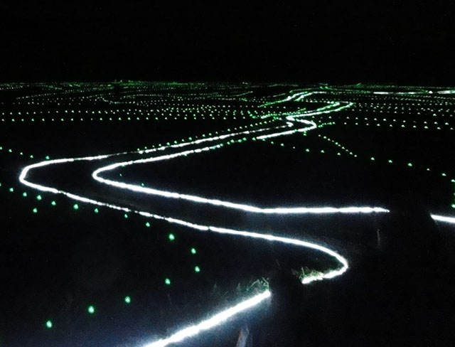 豊後高田市田染小崎の水田イルミネーション。重要文化的景観「田染莊小崎の農村景観」は,本年度2次選定が行われ、1次の約92ヘクタールから613.8ヘクタールへと拡大した。小崎の愛宕池や空木池が構成要素として含まれることとなり、近世の小崎村の全域が選定範囲となった。これを記念する意味もあって選定範囲の水田にイルミネーションが施されることとなったのである。以前から棚田地帯で畦に明かりを灯すところがあったが、小さな缶に油を入れて点火するものであった。今年は、技術の進歩からペットボトル状のものにLEDが入れられて太陽光発電が行われ、何ヶ月も日持ちするようになった。時間によって色の変化も楽しめる。水田の美しい曲線が浮かび上がって、都会のイルミネーションとは違った雰囲気がある。