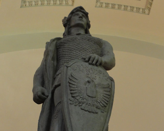 ワシントンD.C.ユニオン駅にあるケントゥリオの彫像。2016年9月9日撮影。このユニオン駅は西洋古典をモチーフとした荘重な建築である。日本の東京駅は、皇居側からの眺望が見事だが、ワシントンの場合には内部が博物館を思わせる空間となっている。見上げるとローマの軍団の百人隊長が白頭鷲のシールドを手にこの駅を守っていることがわかる。「パクスロマーナからパクスアメリカーナへ」を象徴しており、アメリカ人の気概が伝わってくる。