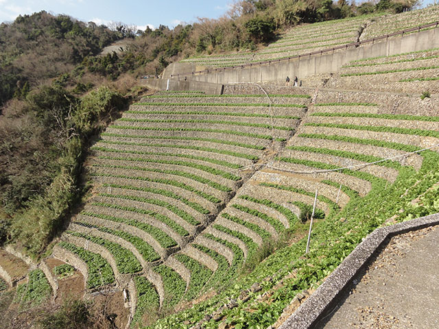 重要文化的景観・遊子水荷浦(ゆすみずがうら・愛媛県宇和島市)の段畑。2017年2月21日撮影。眼の前には美しい宇和海が広がる。暖かい日だまりを利用して馬鈴薯が栽培されている。この地には「段畑を守ろう会」があり、4月には「だんだん祭」が行われ、会員に獲れたての馬鈴薯が振る舞われる。またこれを材料として焼酎「段酌・だんしゃく」が作られている。普通の芋焼酎と違ってコクはあるが、さっぱり味である。棚田景観とはひと味違う迫力があり、2007年7月に3番目の重要文化的景観に選定された。