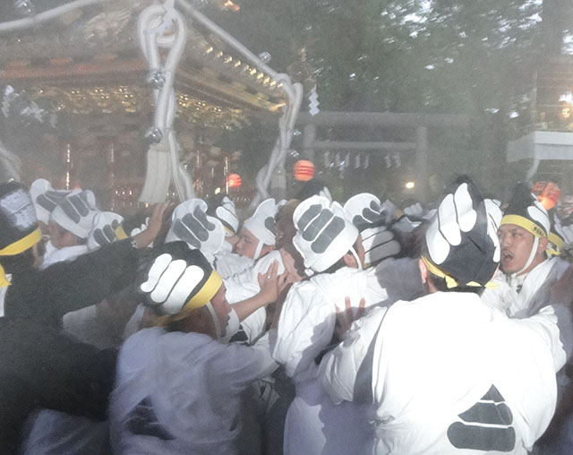 大国魂神社(東京都府中市)の例大祭。「暗闇祭」と呼ぶ。2017年5月5日撮影。武蔵国府中にある惣社で、まさに大国武蔵の中心に位置した神社である。中世には一般に「六所宮」と呼称されていた。この伝統がいまでも引き継がれ、一之宮から六之宮の神輿が激しく練りながら府中の町を行く。さらに本社と御霊宮が入り、計八基の神輿となる。写真は三之宮氷川神社(さいたま市鎮座)の神輿で、担ぎ手の烏帽子に数詞が入る。