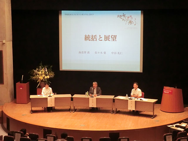 早稲田まちづくりシンポジウム2017「地域の持続のかたちを考える−千年を生き続けた知恵を活かし、ふるさとの暮らしを未来につなげるために−」、2017年7月16日開催。井深ホールは何度か登壇しているのだが、今回が一番印象深いものとなった。というのも創造理工学部社会環境工学科の先生方が取り組んでいる「千年村プロジェクト」を肌で感じることができたからである。300人を超す理系の老若男女の研究者がムラのサスティナビリティーを目的として集まっている。このような状況が生まれようとは棚田学会が立ち上げられたころ(1999年)にも考えられなかったことである。当日いただいた質問が倭名抄郷と明治22年に成立した大字・小字との関係であった。共同研究の大きな潮目を実感した。