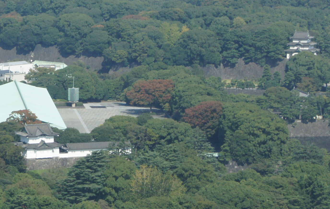 江戸城富士見櫓、伏見櫓と皇居長和殿。現在は照葉樹林の中にある江戸城遺跡と皇居。三層の富士見櫓は本丸の南端にあり、明暦の大火で天守閣焼失後は、実質的に天守閣として機能した。伏見櫓は二重橋の背景となり、西の丸にある皇居の象徴的な建造物。近年、皇居一周のランニングが盛んだが、明治維新後150年の間に巨大な照葉樹の森となったことが多くの人を惹きつける理由であろう。同様に周遊のジョギングコースがあるニューヨークのセントラルパークは全体が落葉樹からなっており、樹相は全く相違する。