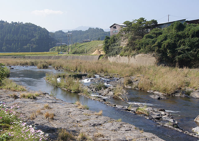 豊後大野市の緒方野中井路取水口。原尻の滝を頭首工とする用水路は下井路と上井路がある。このうち原尻の滝から取水する下井路の開削は古代におよび、平安時代末期には、緒方三郎惟能が下方の条里地割の水田へと通水した。これに対して上井路は、寛文元年(1661)に豊後の竹田藩が開削したものである。原尻の滝の上流部は厚い溶結凝灰岩に覆われており、写真手前のように緒方川右岸を灌漑する野中井路も竹田藩が長年にわたって手を加え、溶結凝灰岩の中を直線的に走っている(飯沼賢司『環境歴史学視点に立つ中世荘園研究』2005年、p.54、図13参照)。小さな滝となっているところが川の本流で、その向こうの葦のなかに上井路の取り入れ水路が走っている。この地点は原尻の滝から約1km上流になるが、一般的な川原の景観とは大きく相違する。