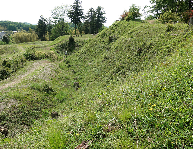 杉山城跡。埼玉県嵐山町。2019年5月5日撮影。2002年度から2007年度にかけて嵐山町教育委員会による調査が行われ、2008年に「比企城館跡群」として国指定史跡となった。この調査により、城郭がつくられた年代は、15世紀から16世紀前半にかけてであり、実質的な築城主体は山内上杉氏の勢力下にあった守護代クラスの武蔵国または上野国の武士であった可能性が高くなった。