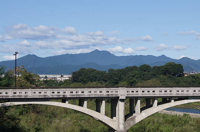 東秋留橋から大岳(おおたけ)山・御岳(みたけ)山奥ノ院を望む。御岳神社には伝畠山重忠の赤糸威大鎧が伝存し、武蔵国の原風景となっている。2020年9月28日撮影。手前の橋は旧東秋留橋で1939年に完成した鉄筋コンクリートのアーチ橋。リズミカルで美しく、土木学会推奨土木遺産。現在は、歩行者・自転車走路となり、保存されている。