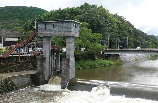 中津市本耶馬溪町樋田にある荒瀬井堰。2020年9月25日撮影。大分県立歴史博物館が行っている「大分県荘園村落遺跡詳細分布調査」の委員会現地視察。