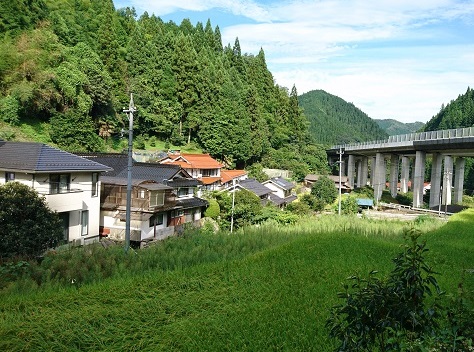 岡山県新見市の谷内集落。橋脚が見えているのは中国自動車道。2022年8月19日撮影。かつて『週刊朝日百科 日本の歴史2 中世Ⅰ-2 中世の村を歩く 寺院と荘園』(1986年)の67頁に掲載された写真とほぼ同じアングルで撮影した。現在もこの集落は変わらぬ佇まいを保っている。