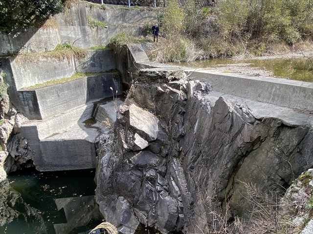 たいへん規模が大きく現在でも荒々しい岩壁が露出している。200%程度に画像を拡大していただくとわかるが、海老澤は中央上に小さく映っている。コンクリートで保護されているものの、自然頭首工としての原初的な形態を残している。