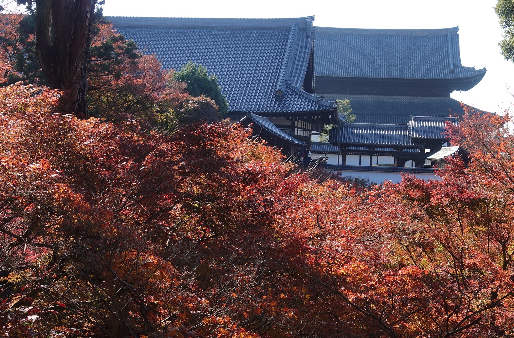 東福寺の方丈と仏殿。2023年12月4日撮影。嘉禎2年(1236)に九条道家が氏寺法性寺内に伽藍建立を発願してこの大寺院の造営に着手した。開山は円爾弁円。谷筋をうまく生かして回廊をめぐらした伽藍配置が誠に見事である。