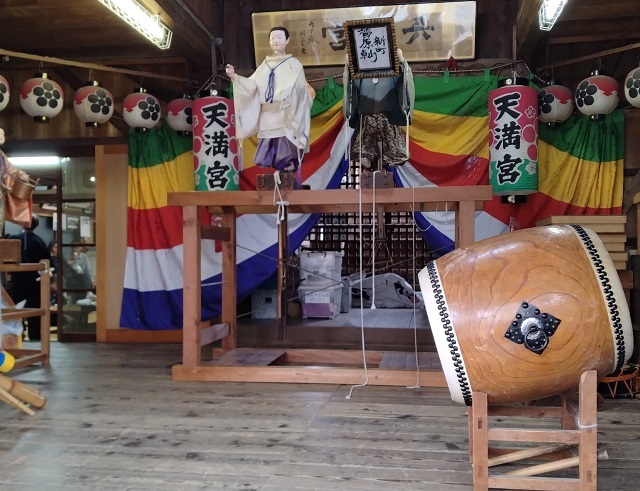翌日は大垣祭りだが、小雨模様だったため、各町ではこのような時のための催しがおこなわれた。新町が保存する菅原ヤマでは菅原道真の人形が筆を持って額に字を書き、この半紙が宙を舞い、祭りに集まった人たちがそれをありがたく頂戴するというものである。この日は天満宮の社殿の中でヤマを分解して、このカラクリを見学者の目前で実演する。二人で作業をするが、筆を担当する人と額を担当する人が息を合わせて絡繰りを動かし、ヤマの上にいる人形が字を書き上げていくのである。誠に見事な伝統芸だ。