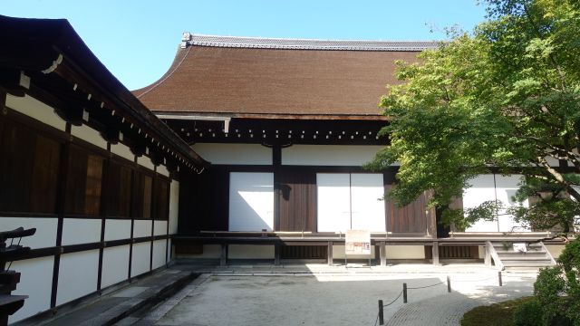 京都知恩院の大方丈・小方丈。2025年10月6日撮影。知恩院の伽藍の中では比較的小さな建物だが、入母屋造りで、檜皮葺きの屋根が雅である。また、その前面には美しい池を配した方丈庭園が広がっている。寛永18年(1641)に将軍の宿所として建立された。