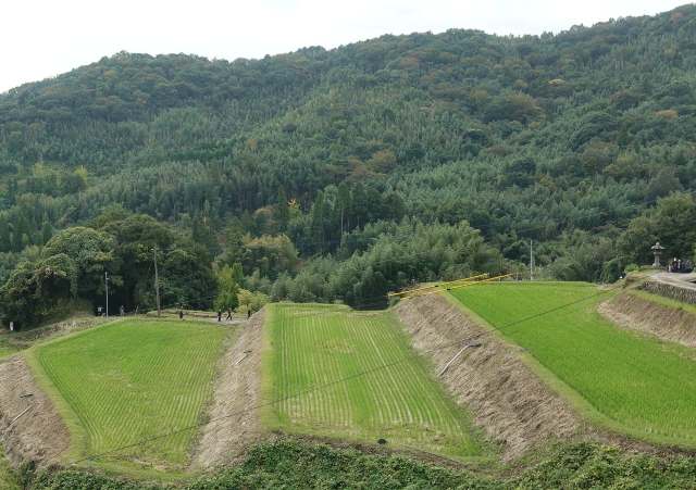 写真は史跡指定を受けている円満寺の前から東方を撮影したもの。南から北に樫井川が流れている。この川が山間部から平野部に流れを変えるところで取水された用水路「井川」が史跡の慈眼院・日根神社内を通過して扇状地を横断し、巨大な十二谷池(史跡:羽田―九州の旅客機の窓からしばしば確認できる)に入る。その全行程が史跡となっている。このように灌漑水路が現代に残る荘園遺跡を有機的に結びつけている希有な事例。